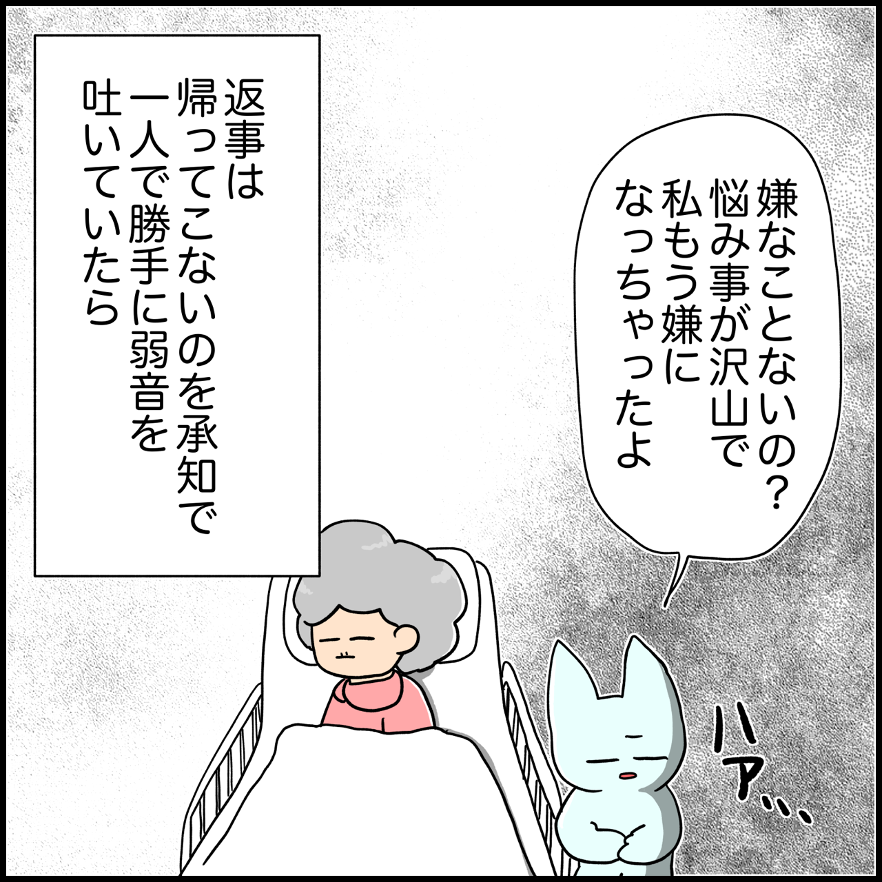 認知症という病のせいで自分が何に悩んでいるかということにも焦点を当て続けるのが難しくなられているのではないか、と思うと何だか切ないです。