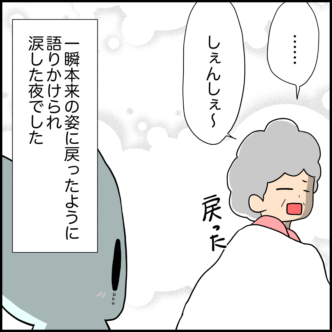 【介護師漫画】重度の認知症患者さんに弱音を吐いていたら、思いがけないことが起こった 2022年11月18日 フォロワーさんからいただいたエピソードをもとに漫画を描きました。ふいに昔の記憶など蘇り、短時間だけど元の健常だった頃に戻られること、あります。びっくりすると共の、こんな感じの方だったんだって、その方をぐっと知れた気がして嬉しくなります。 「忘れられないエピソード」カテゴリの最新記事 < 前の記事次の記事 > コメント コメント一覧 (1) 1. 通りすがりの看護師さん 2022年11月19日 01:21 そのお言葉、今現在の彼女自身の事も含めて語られたのかもしれないと思うと何だか胸がキュッとなりました… 認知症という病のせいで自分が何に悩んでいるかということにも焦点を当て続けるのが難しくなられているのではないか、と思うと何だか切ないです。 ですが利用者さんの今の状態に縛られず、1人の人間同士としての会話を引き出せたスタッフさんの関わり方や自己開示はとっても素敵だなぁと感じました。学ばせていただいた思いです。 0 ぱれちに がしました コメントフォーム 名前 コメント 記事の評価 リセット リセット 顔 星 情報を記憶 コメントを投稿する