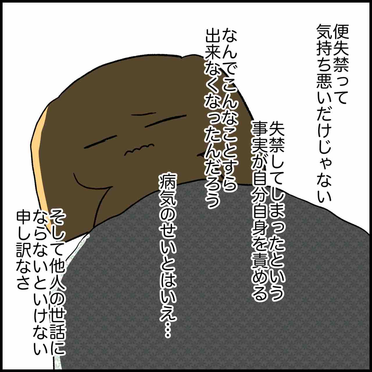 カテゴリ :経験談 【漫画】私「(便失禁してしまった)」その辛さは… 失禁は辛いし、自尊心も傷だらけになります。便だけでなく尿も皮膚トラブルの原因になります。尿は放っておくとアンモニアに変化しアルカリ性になるため、皮膚炎の原因になります。清拭したり微温湯で洗い流してあげましょう。 ... 失禁は辛いし、自尊心も傷だらけになります。便だけでなく尿も皮膚トラブルの原因になります。尿は放っておくとアンモニアに変化しアルカリ性になるため、皮膚炎の原因になります。清拭したり微温湯で洗い流してあげましょう。