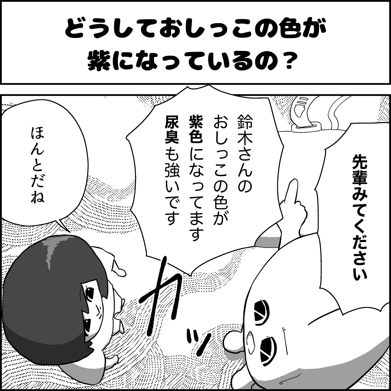カテゴリ :勉強漫画 【看護師漫画】どうしておしっこの色が紫になっているの? たまに見かけるこの現象。なんやろ?と思って調べて勉強ついでに漫画にしました。 ... たまに見かけるこの現象。なんやろ?と思って調べて勉強ついでに漫画にしました。